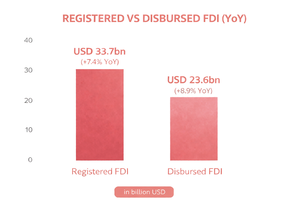 Disbursed FDI rose to USD 23.6 billion (+8.9% YoY)
